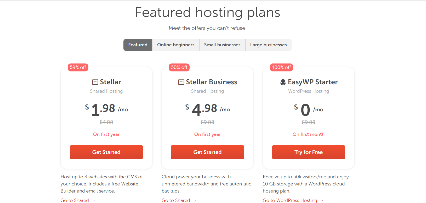 Shared Hosting (Stellar) $1.98/mo Beginners & personal sites Free domain, SSL, 20GB SSD storage